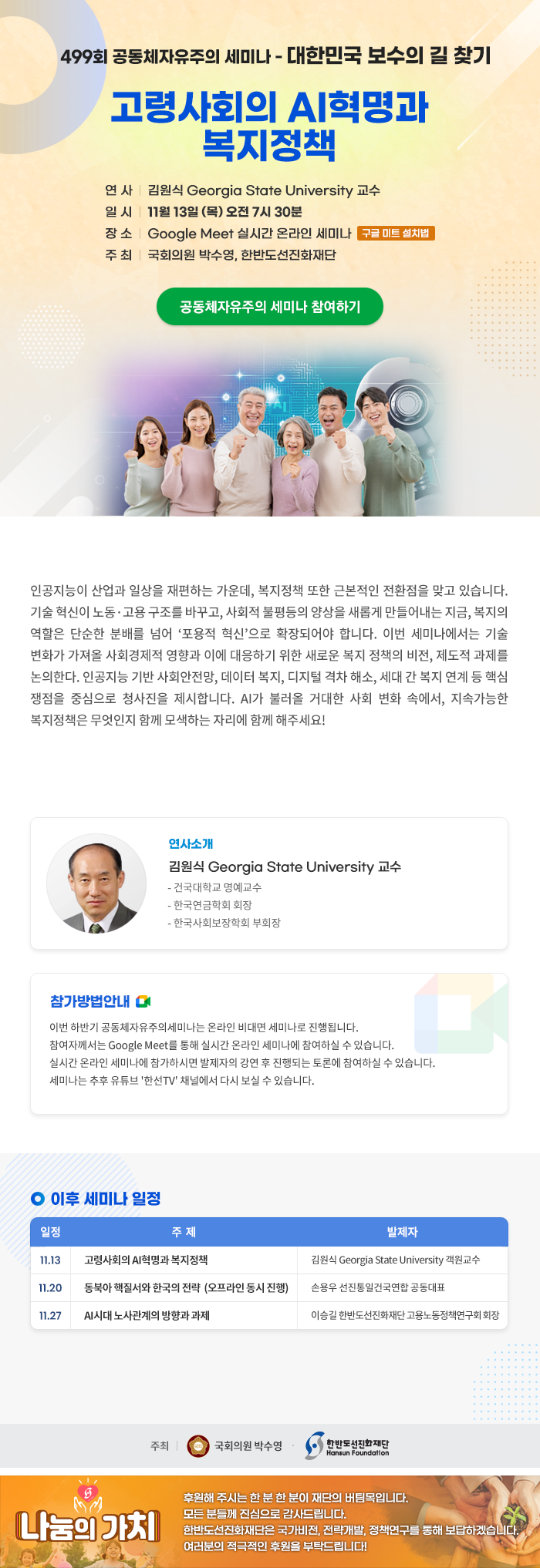 [499회 공동체자유주의 세미나] 고령사회의 AI혁명과 복지정책(11월 13일(목) 7시 30분, 구글미트)