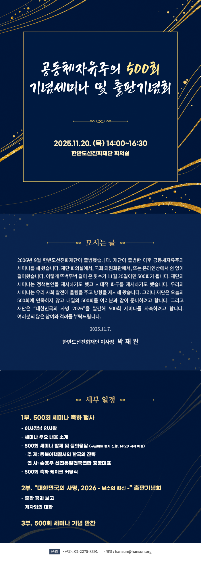 공동체자유주의 500회 기념세미나 및 출판기념회(11월 20일(목) 14시, 재단회의실)