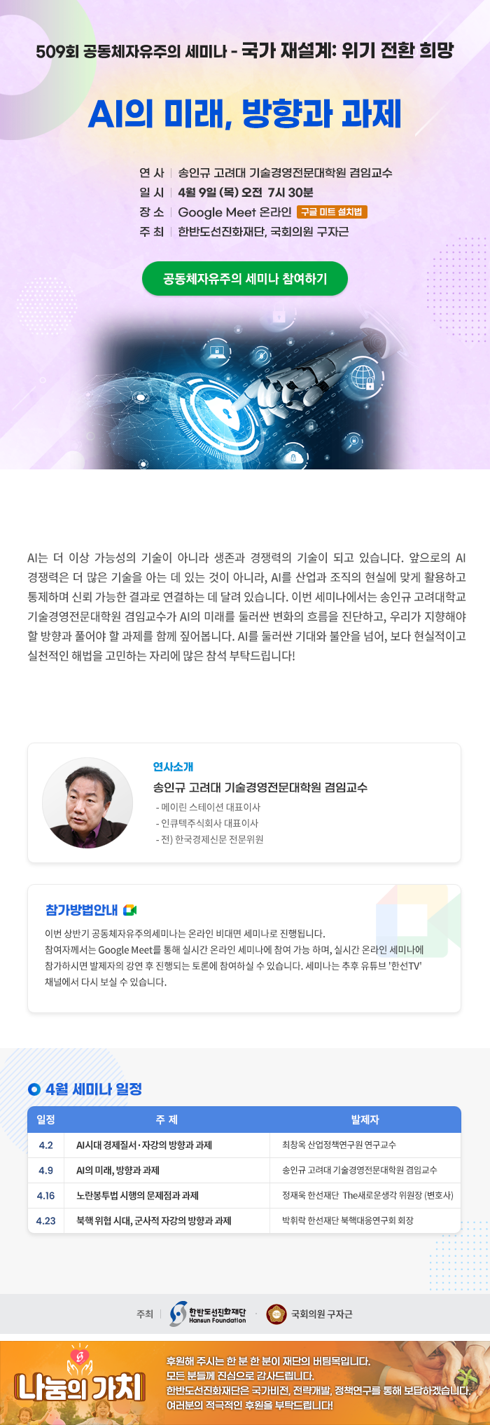 [509회 공동체자유주의 세미나] AI의 미래, 방향과 과제 (4월 9일 오전 7시 30분, ..