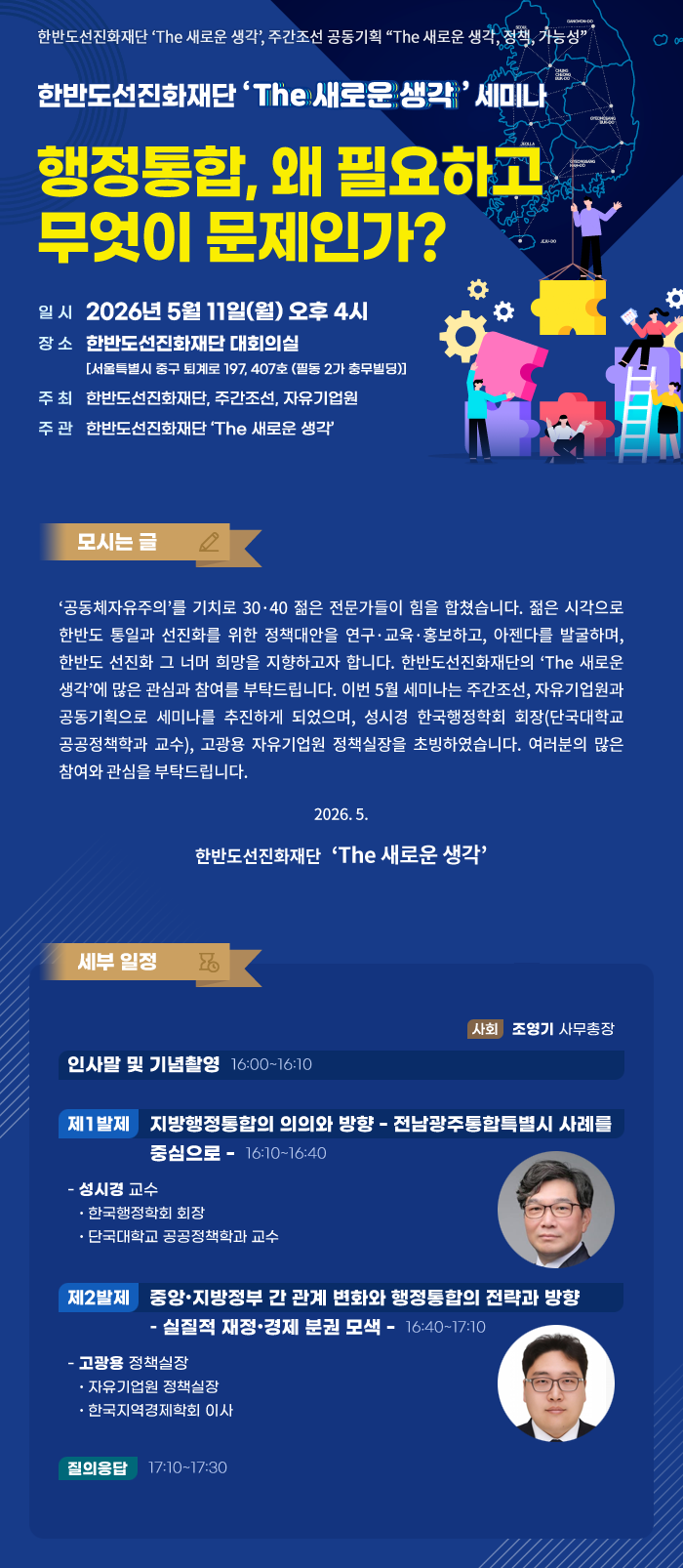 [세미나] 'The 새로운 생각' 정기세미나 - 행정통합, 왜 필요하고 무엇이 문제인가(5월 11일,16시)